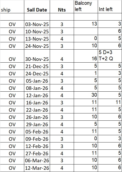 Let us know if you wish to block dates for any of the sailings mentioned above.